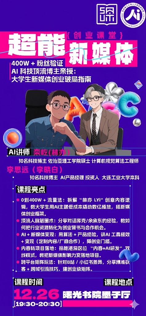 活动海报-创业课堂:大学生新媒体创业破局指南